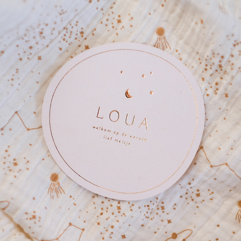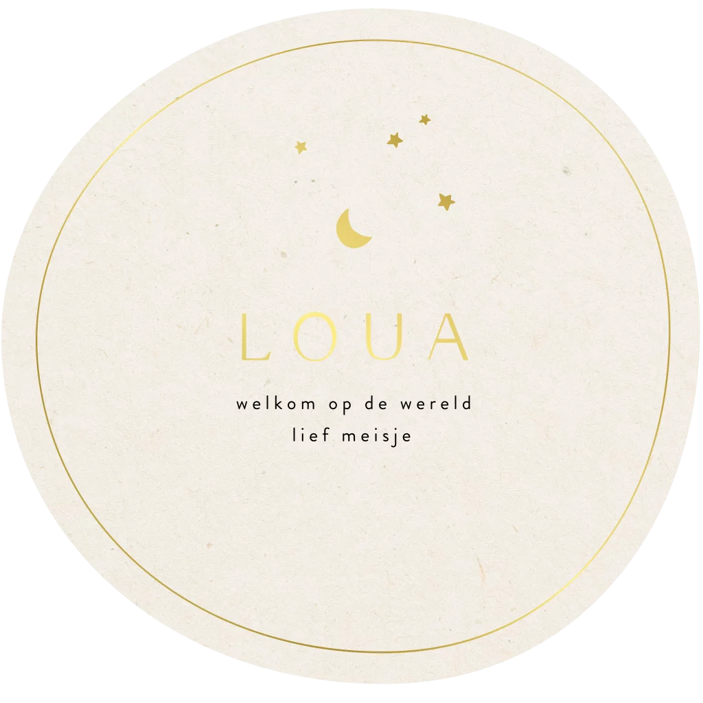 Geboortekaartje in een gestanste vorm, karton-look achtergrond en goudfolie tekst, maan en sterren.