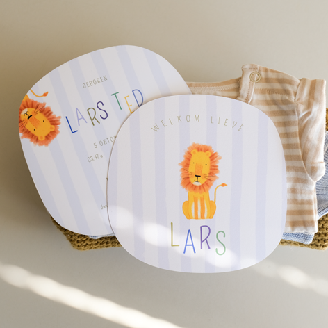 Dit schattige geboortekaartje met een leeuwtje en dansende letters is perfect voor de aankondiging van de geboorte van jullie kleintje. De speelse opstelling van de letters voegt een vrolijke en originele touch toe aan het kaartje. Bovendien kun je het kaartje, het lettertype en de kleuren eenvoudig aanpassen naar jullie wensen, zodat het perfect aansluit bij jullie stijl.