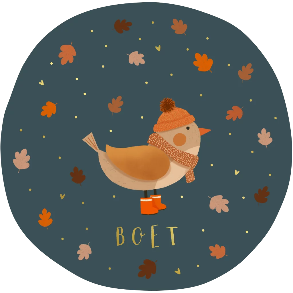 Gestanst rond geboortekaartje met een vogel, blaadjes en goudfolie.