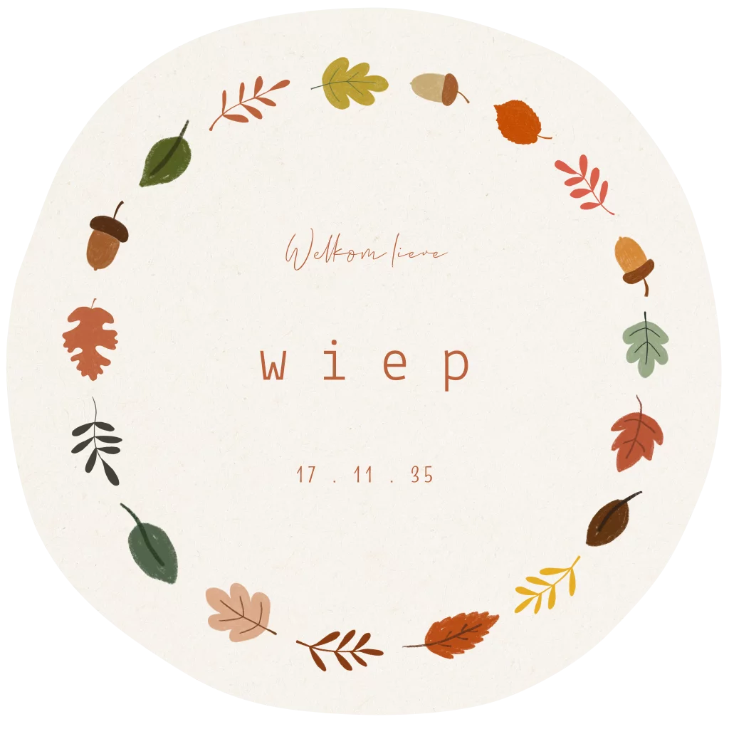 Herfstig rond geboortekaartje met blaadjes en eikeltjes