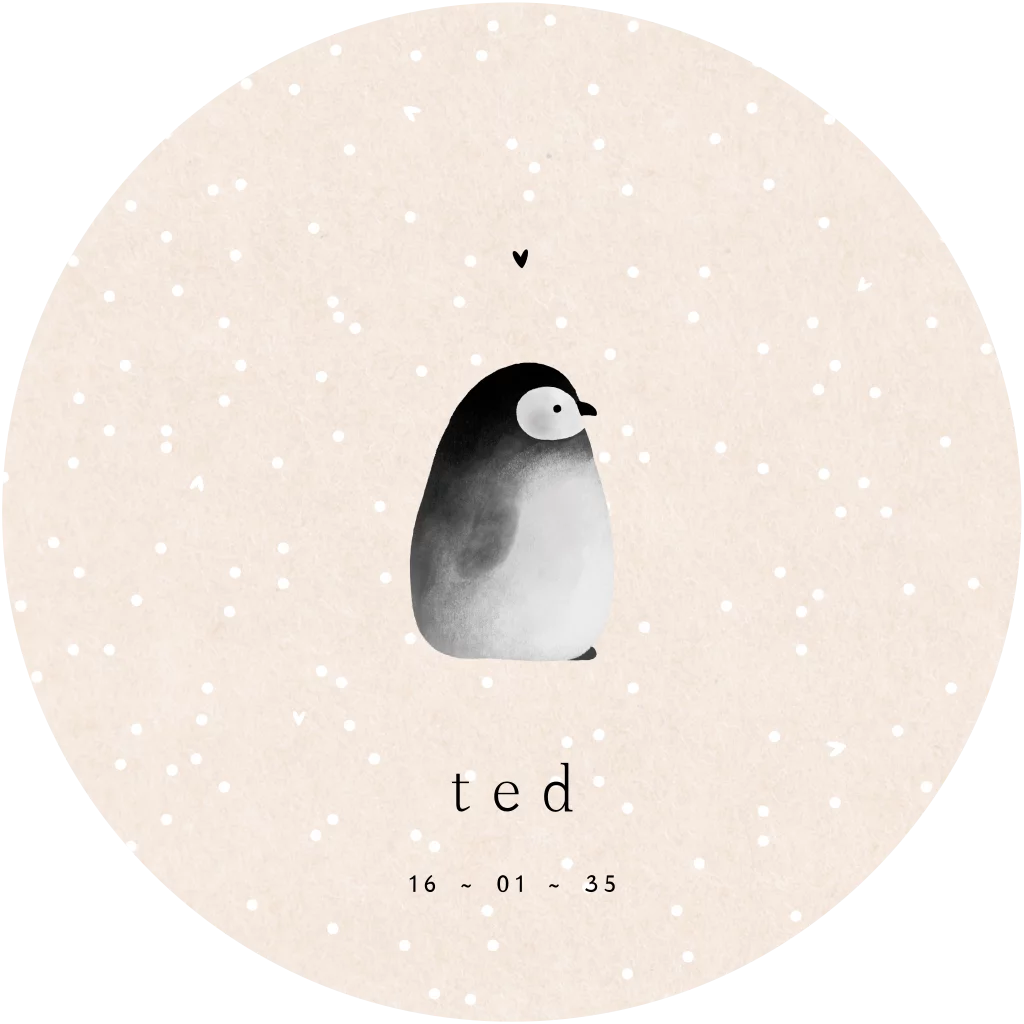 Lief rond winters geboortekaartje met een baby pinguïn, sneeuwvlokjes, een hartje en een karton-look achtergrond.