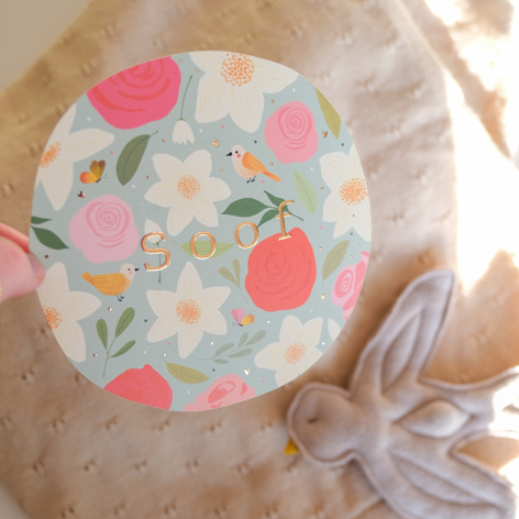 Gestanst rond roséfolie geboortekaartje met bloemen, jasmijn en rozen, blaadjes, vogels, vlindertjes, stipjes en hartjes.