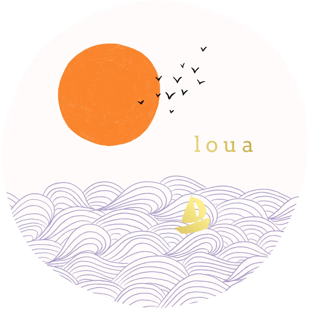 Rond geboortekaartje met golven, een bootje, vogels en de zon. Het bootje en de tekst staan in goudfolie.