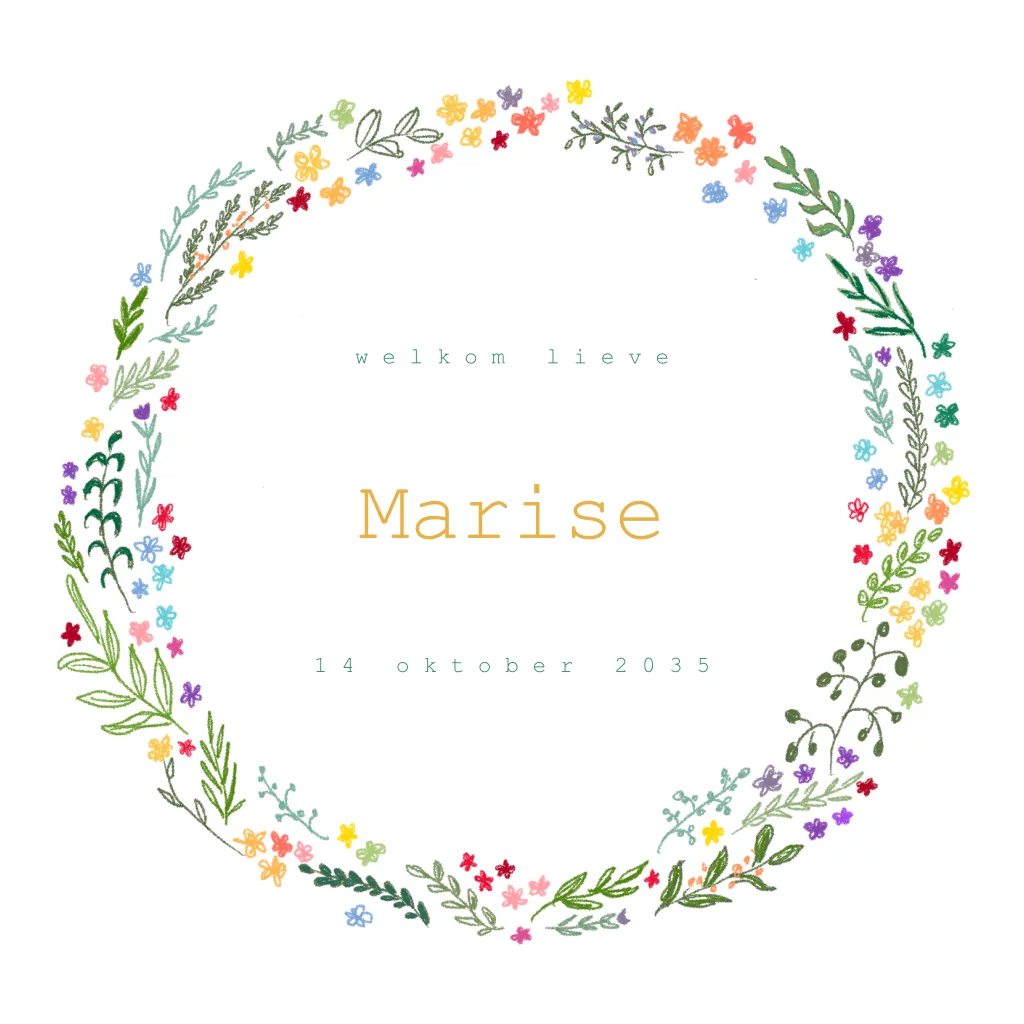 Rond geboortekaartje met een krans van gekleurde bloemen