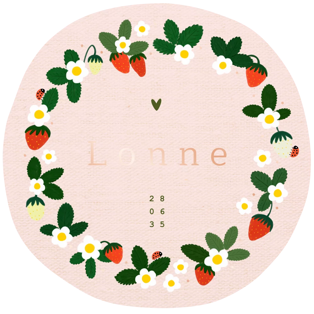 Rond geboortekaartje met linnen-look, aardbeitjes en rosefolie