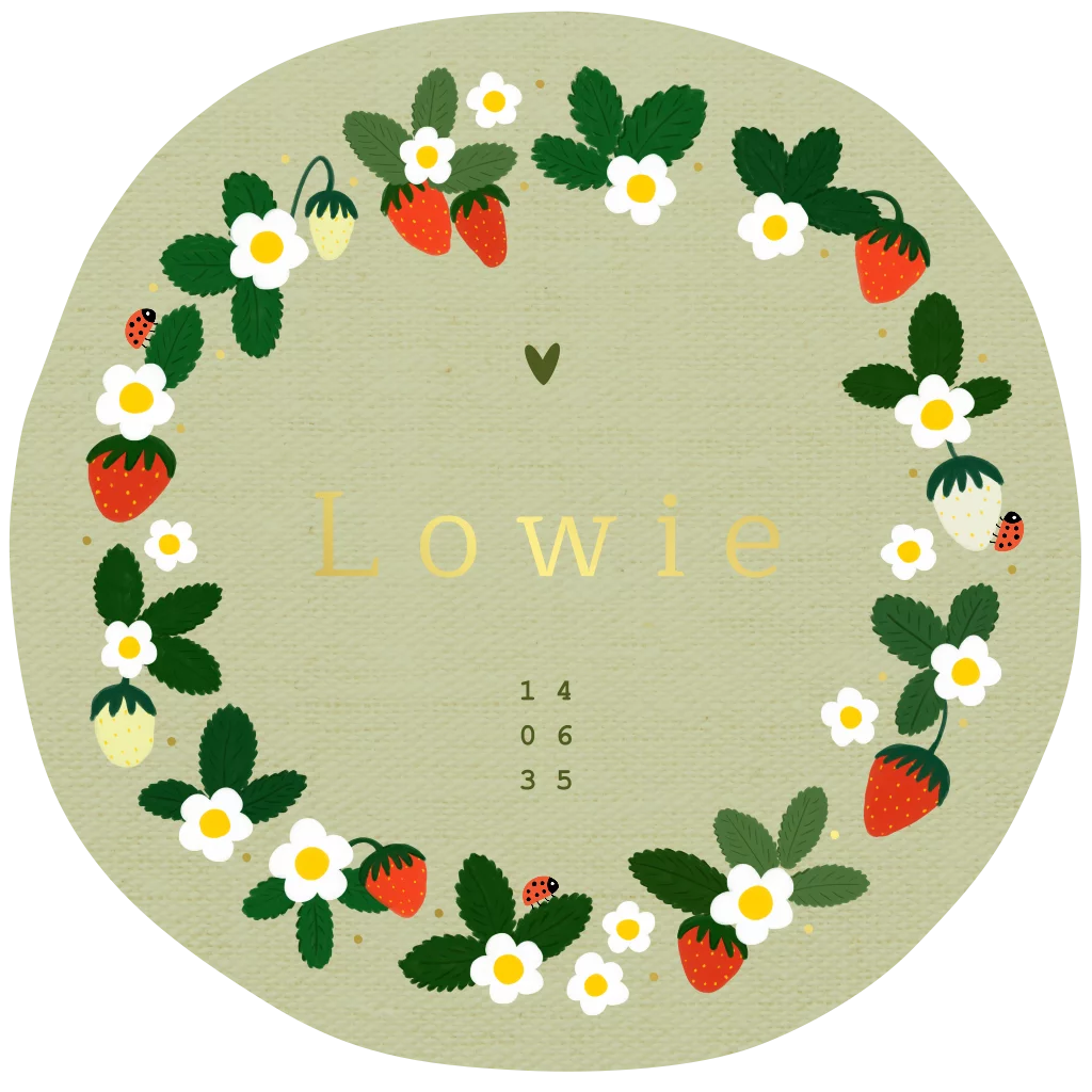 Rond geboortekaartje met linnen-look, folie en aardbeitjes