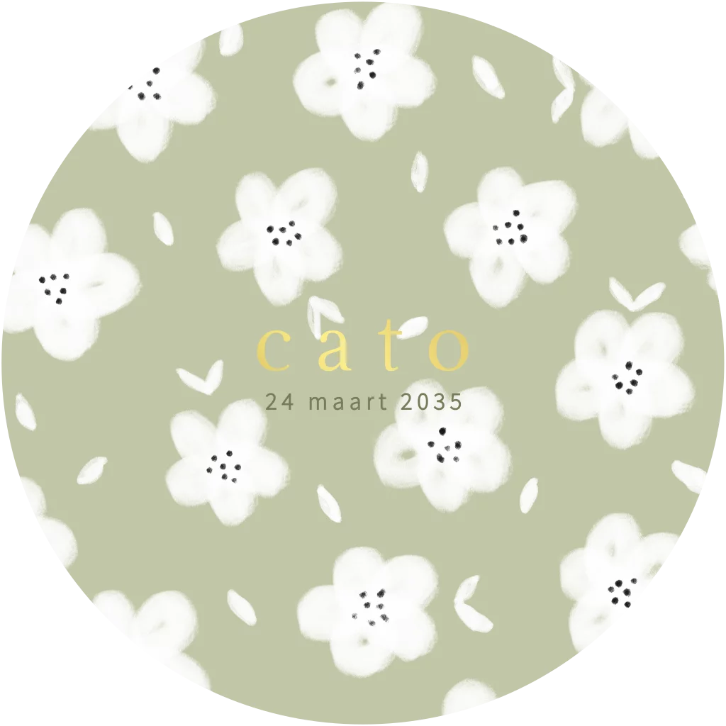 Rond geboortekaartje met goudfolie, bloemen en een groene achtergrond.