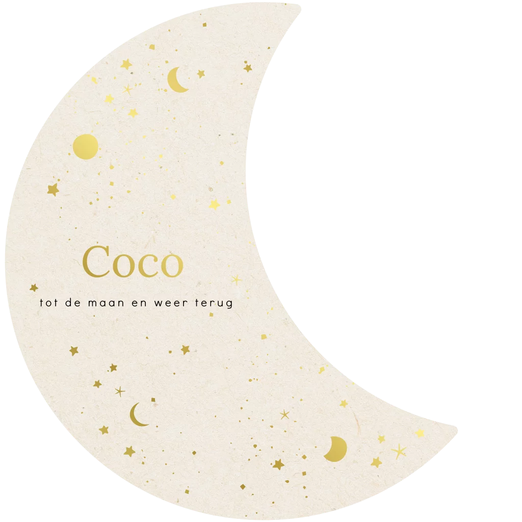 Gestanst geboortekaartje in de vorm van een maan met sterren, manen en met goudfolie.