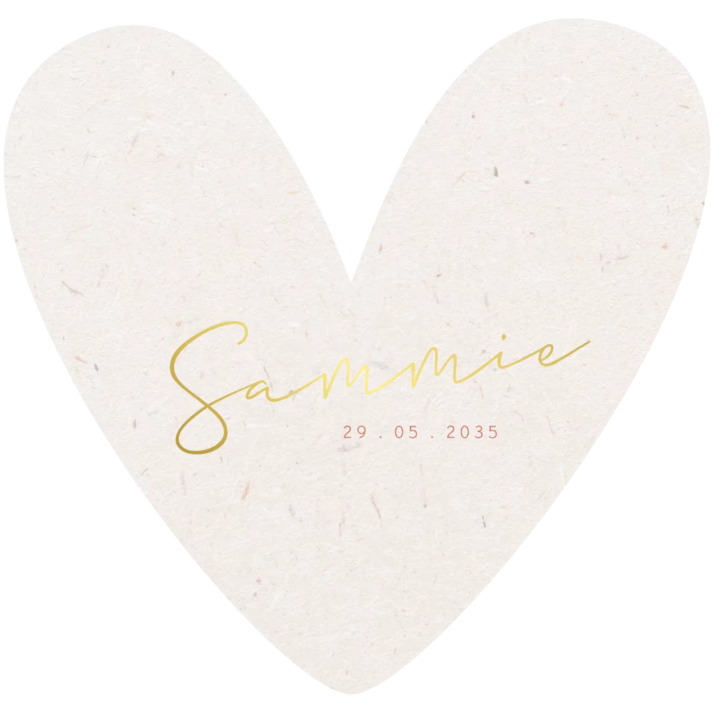 Stans geboortekaartje in de vorm van een hartje, een achtergrond van geschept papier en de tekst op de voorkant van het kaartje in goudfolie.