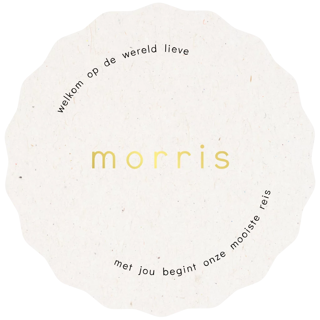 Stans geboortekaartje met de tekst op de voorkant van het kaartje in een boog-vorm, de naam in goudfolie en de rand van het kaartje in een kartel vorm.