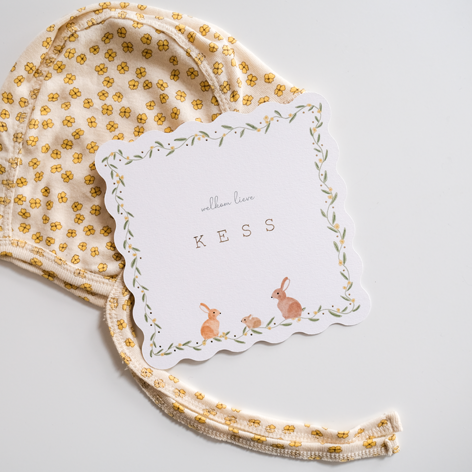 Gestanst geboortekaartje met konijntjes, blaadjes, bloemen en goudfolie.