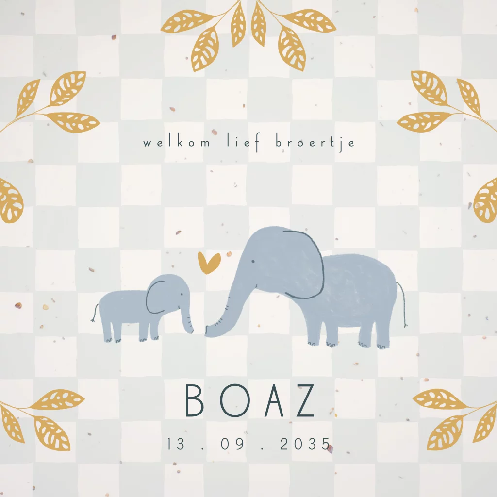Op zoek naar een uniek en duurzaam geboortekaartje voor jullie aanstaande tweede kindje? Dit prachtige eco geboortekaartje met twee schattige olifantjes en blaadjes van een gatenplant is misschien wel precies wat jullie zoeken. De achtergrond heeft een lichtblauw ruitjespatroon en geeft het kaartje een speels en lieflijk karakter. Het papier waarop het kaartje gedrukt is, is gemaakt van circulair tulpenbollen papier, waardoor het niet alleen milieuvriendelijk is, maar ook een unieke uitstraling heeft.