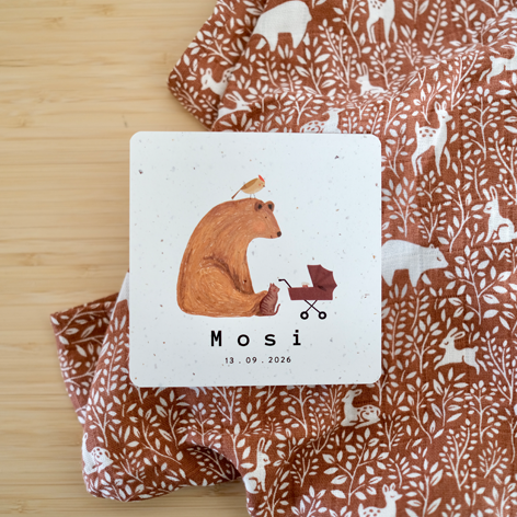 Duurzaam eco geboortekaartje met een beer, kat, vogel en een kindje in kinderwagen.
