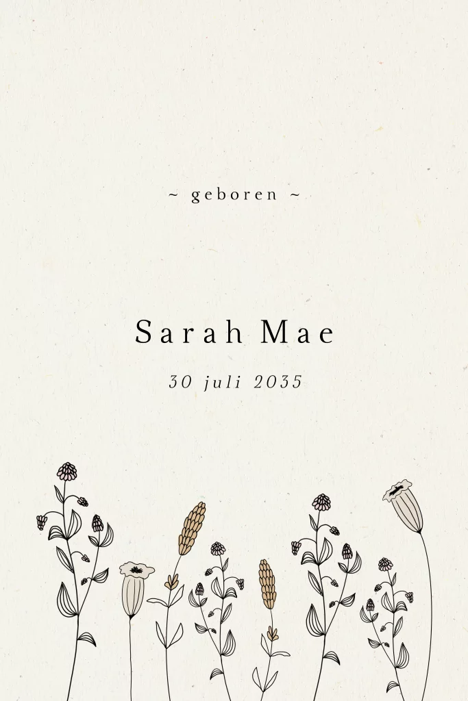 Enkel staand geboortekaartje met bloemen en ronde hoeken.