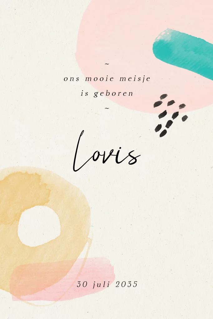 Enkel staand geboortekaartje met waterverf elementen - deze kun je indien gewenst een andere kleur geven - en ronde hoeken.