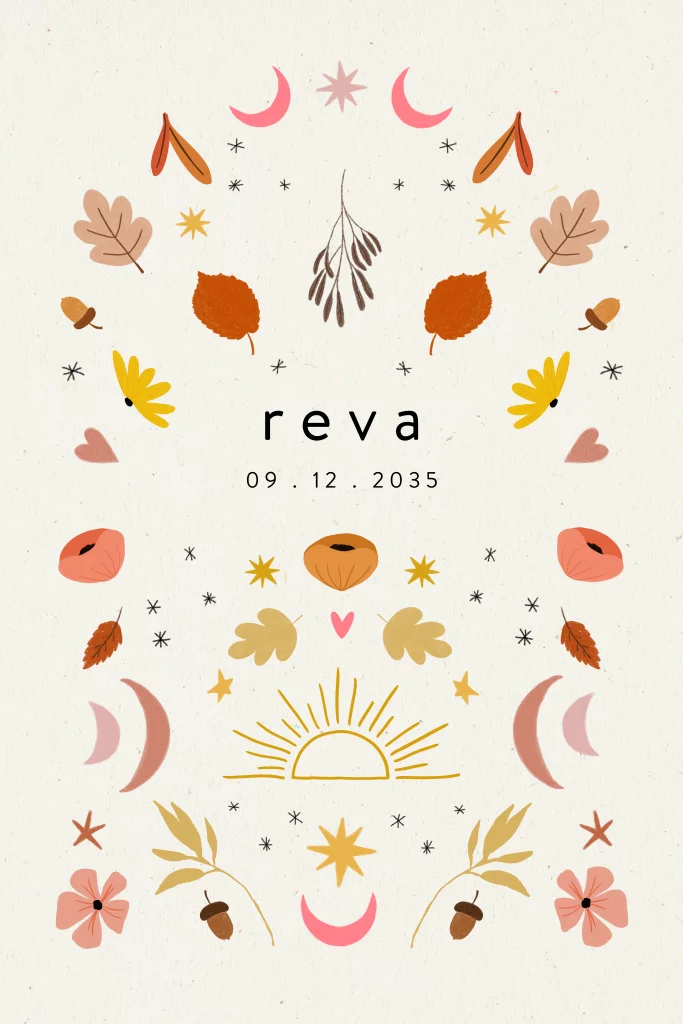 Een herfst boho geboortekaartje met blaadjes, manen en sterren.