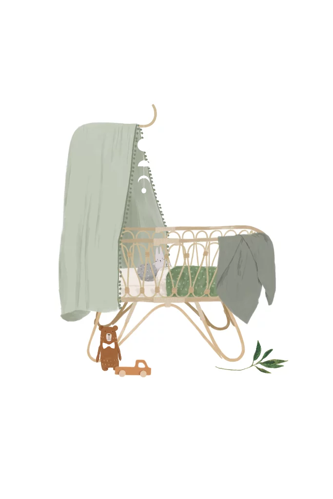 Dubbel staand geboortekaartje met een rotan wiegje en goudfolie.