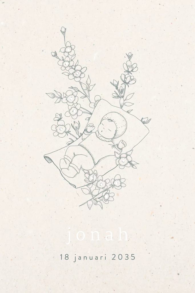 Enkel nostalgisch geboortekaartje met en lief kindje, bloemen, goudfolie en ronde hoeken.