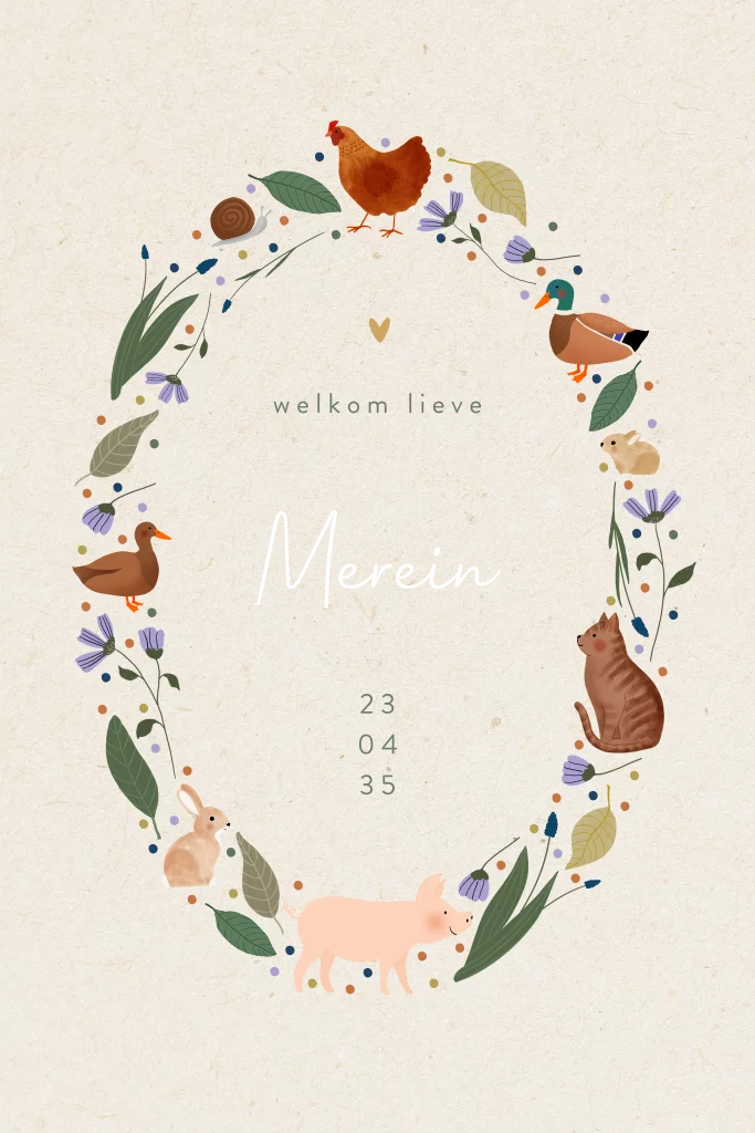 Geboortekaartje met boerderij dieren -een varkentje, kip, eend, kat, slak, konijntjes - blaadjes, bloemen, goudfolie en ronde hoeken.
