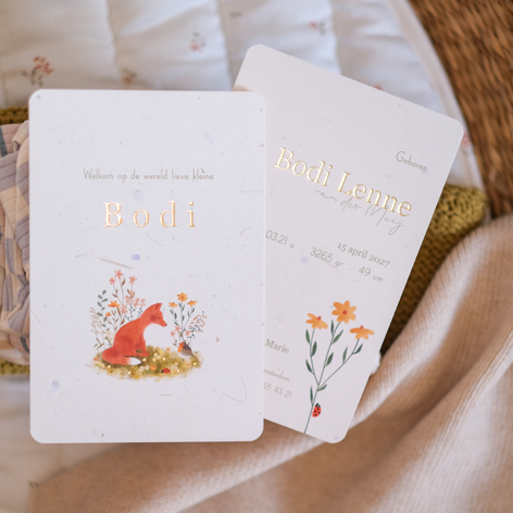 Geboortekaartje met een lief vosje, vogeltje en lieveheersbeestje, bloemen en goudfolie. De achtergrond van dit kaartje heeft een geschepte bloemenpapier-look.