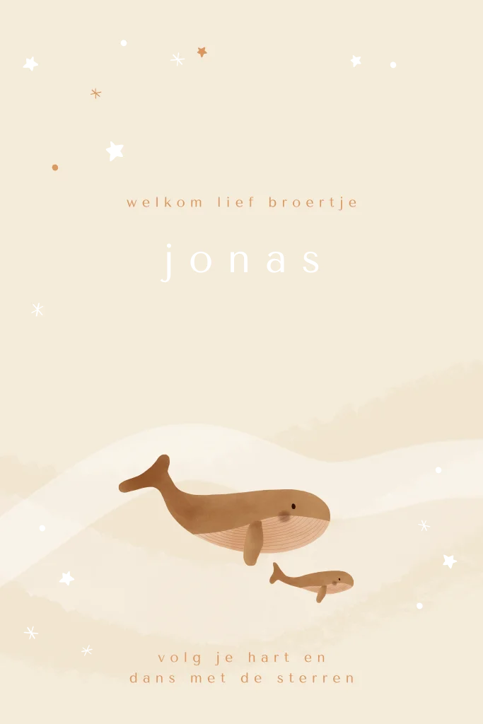 Geboortekaartje met walvissen, golven, sterren en goudfolie