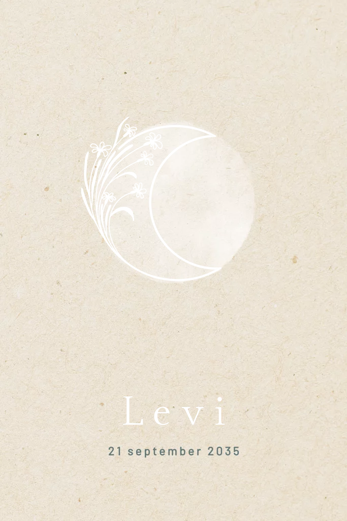 Geboortekaartje met bloemen-maan, goudfolie, een kartonlook achtergrond en rondehoeken.