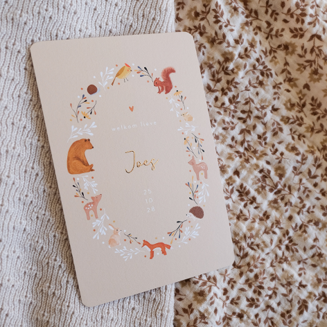 Geboortekaartje met bosdieren en blaadjes en bloemen