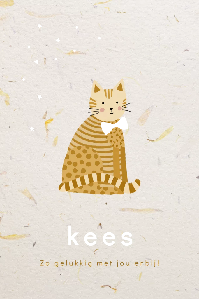 Geboortekaartje met een geïllustreerde kat, goudfolie en ronde hoeken