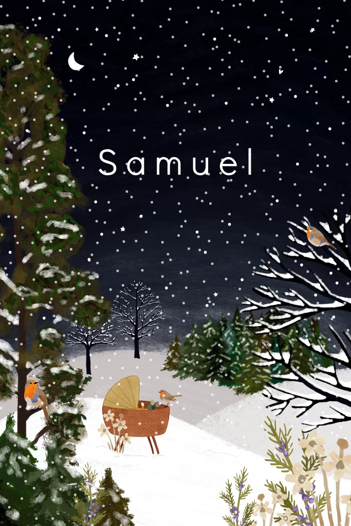 Geboortekaartje met goudfolie voor een winterkindje. Dit prachtige kaartje toont een betoverend winters landschap met een vleugje magie. De nacht is gevuld met sneeuwvlokken, fonkelende sterren en een glinsterende maan, terwijl een wiegje op een heuvel staat waar een nieuwsgierig roodborstje het pasgeboren kindje bewondert.