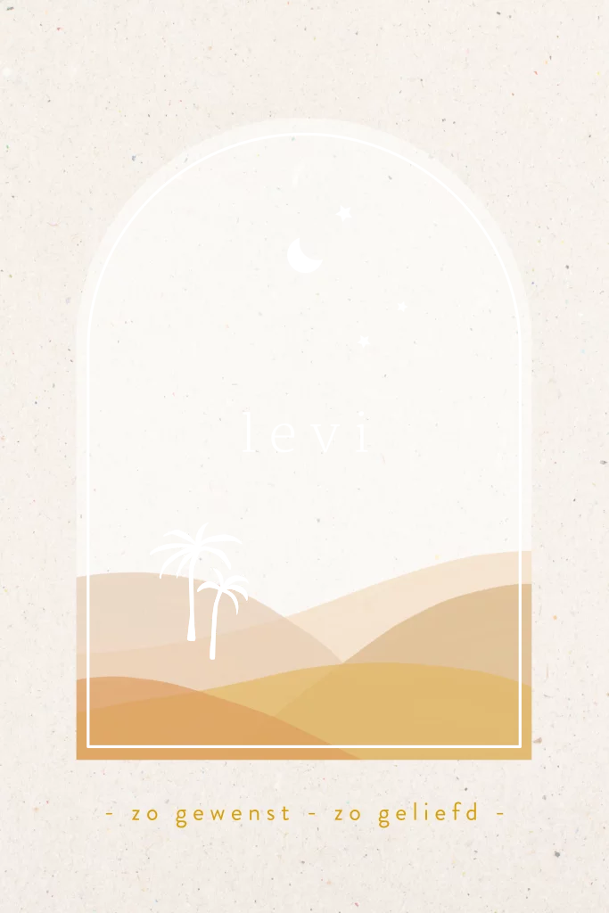 Geboortekaartje met een arch, goudfolie, maan en sterren en palmbomen in een woestijn landschap.