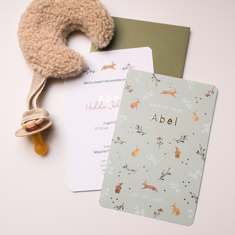 Een geboortekaartje met lieve konijntjes en goudfolie