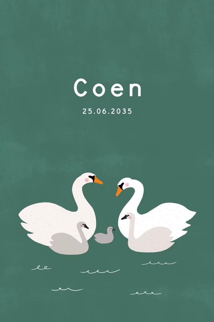 Geef je zoon of dochter een uniek geboortekaartje met deze kaart met een zwanen familie en goudfolie. De kaart heeft een mooie groene achtergrond en is voorzien van goudfolie op de voor- en achterkant