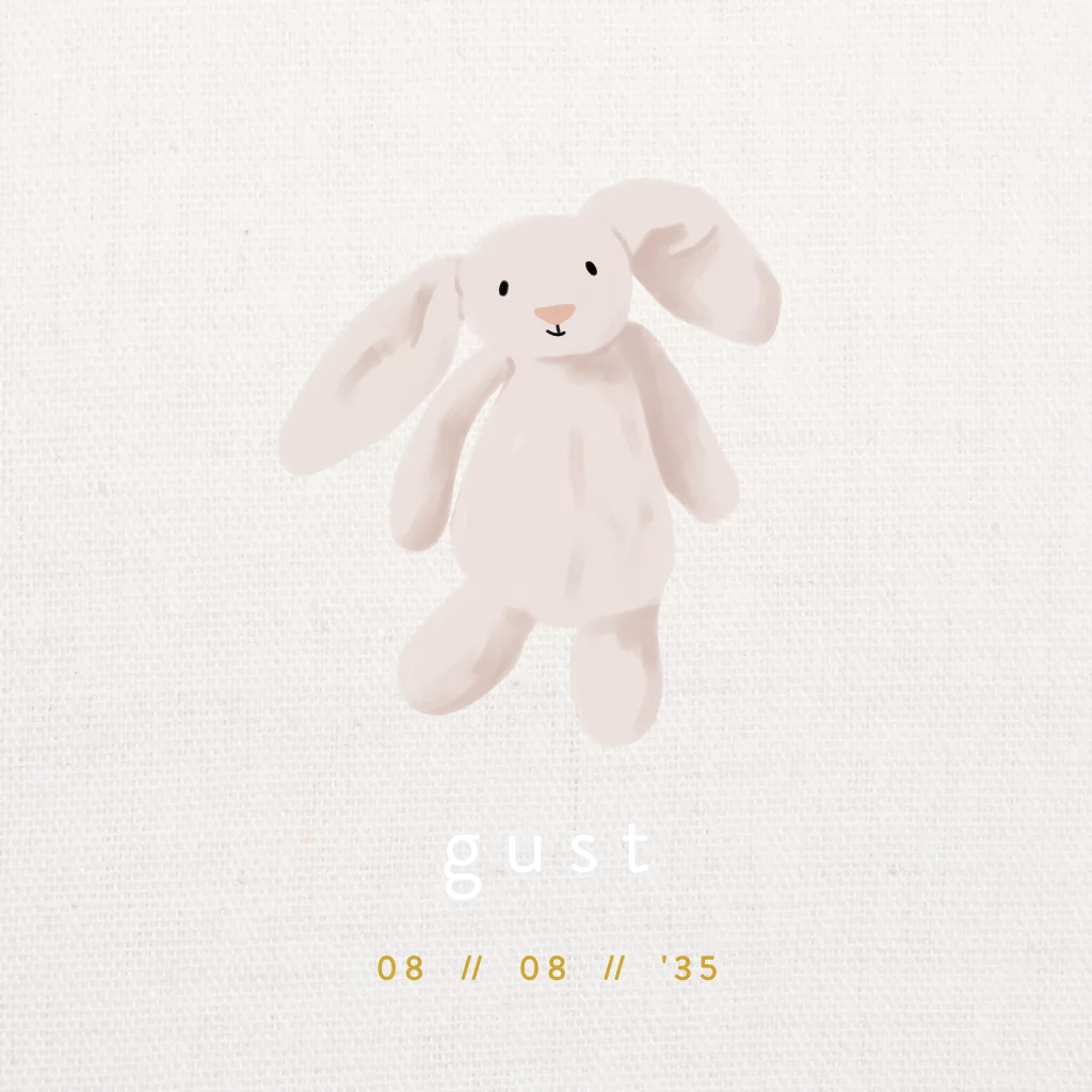 Vierkant geboortekaartje met linnen-look achtergrond, een geïllustreerd knuffel-konijn en goudfolie.
