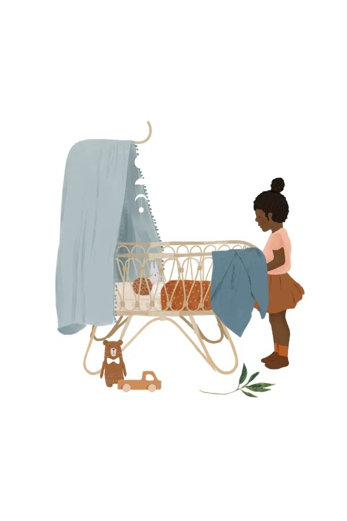 Geboortekaartje met een grote zus naast een rotan wiegje en goudfolie