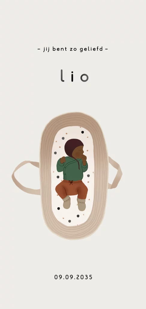 Langwerpig geboortekaartje met zwartfolie en een lieve baby in een mozesmandje.