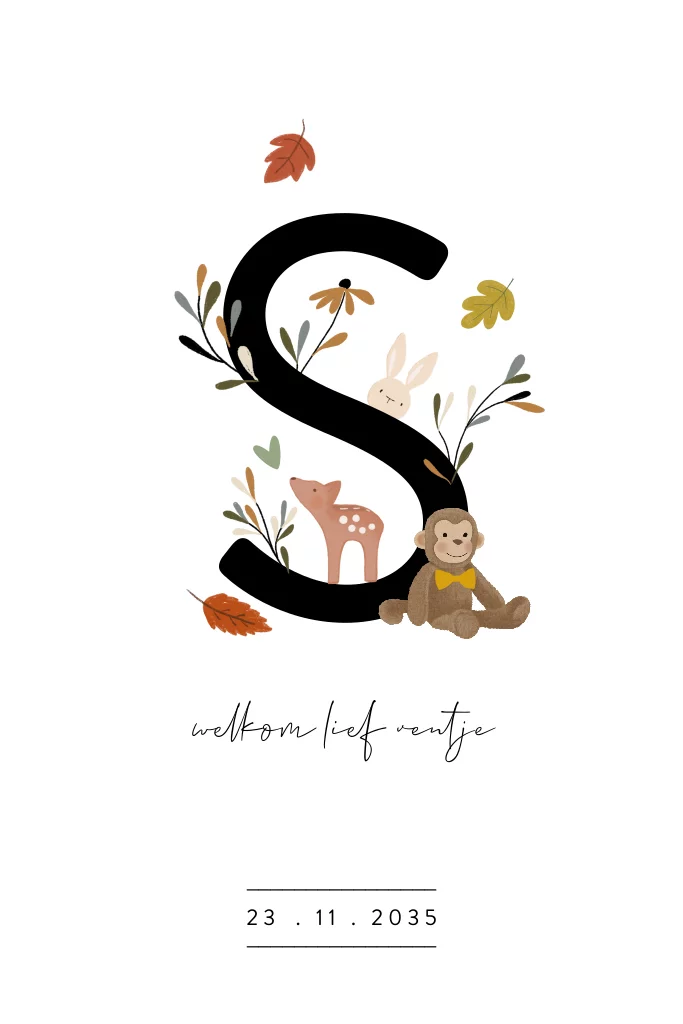 Lief geboortekaartje met grote letter / initiaal, vallende blaadjes, knuffels en goudfolie.