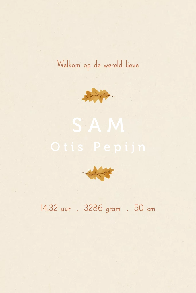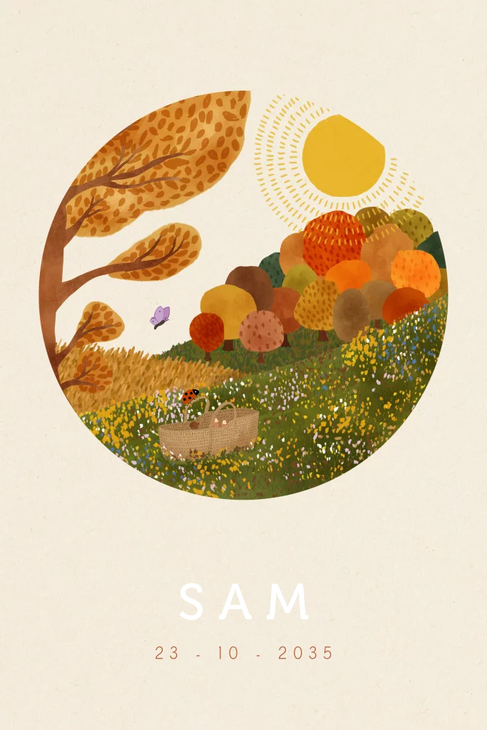 herfstkaartje met bomen, dieren, een baby en goudfolie