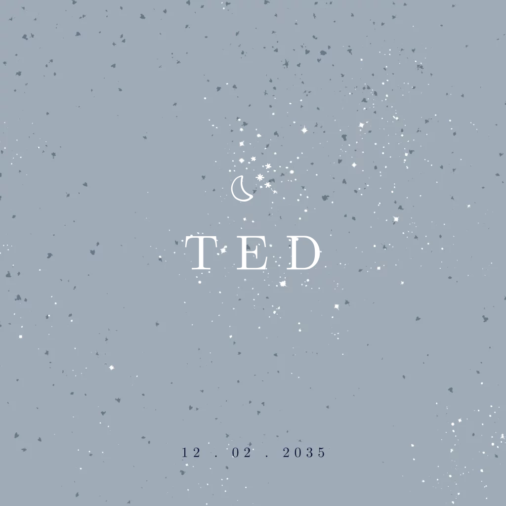 Klassiek geboortekaartje met een zachtblauwe achtergrond. De tekst op de voorkant van het geboortekaartje staat in goudfolie net als een klein maantje en sterren.