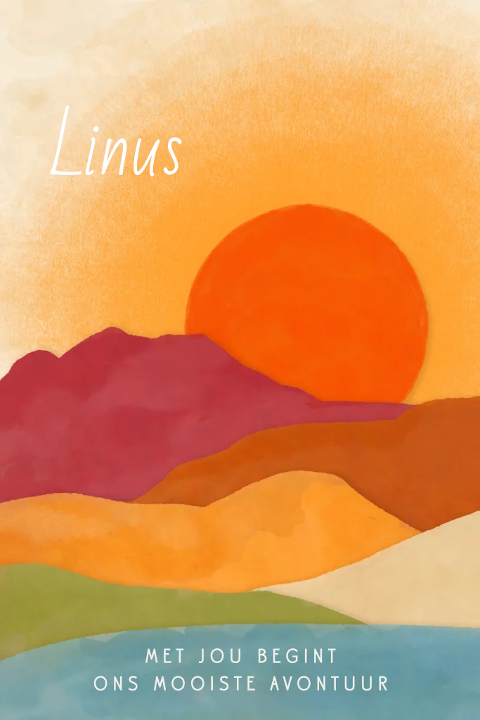Dit unieke kaartje is perfect voor ouders die houden van natuurlijke en trendy elementen, en die hun blijdschap willen delen met een origineel en opvallend geboortekaartje. Laat de aankondiging van jullie kleintje een onvergetelijk moment worden met dit prachtige geboortekaartje dat de warmte van de zon en de pracht van de bergen omarmt.