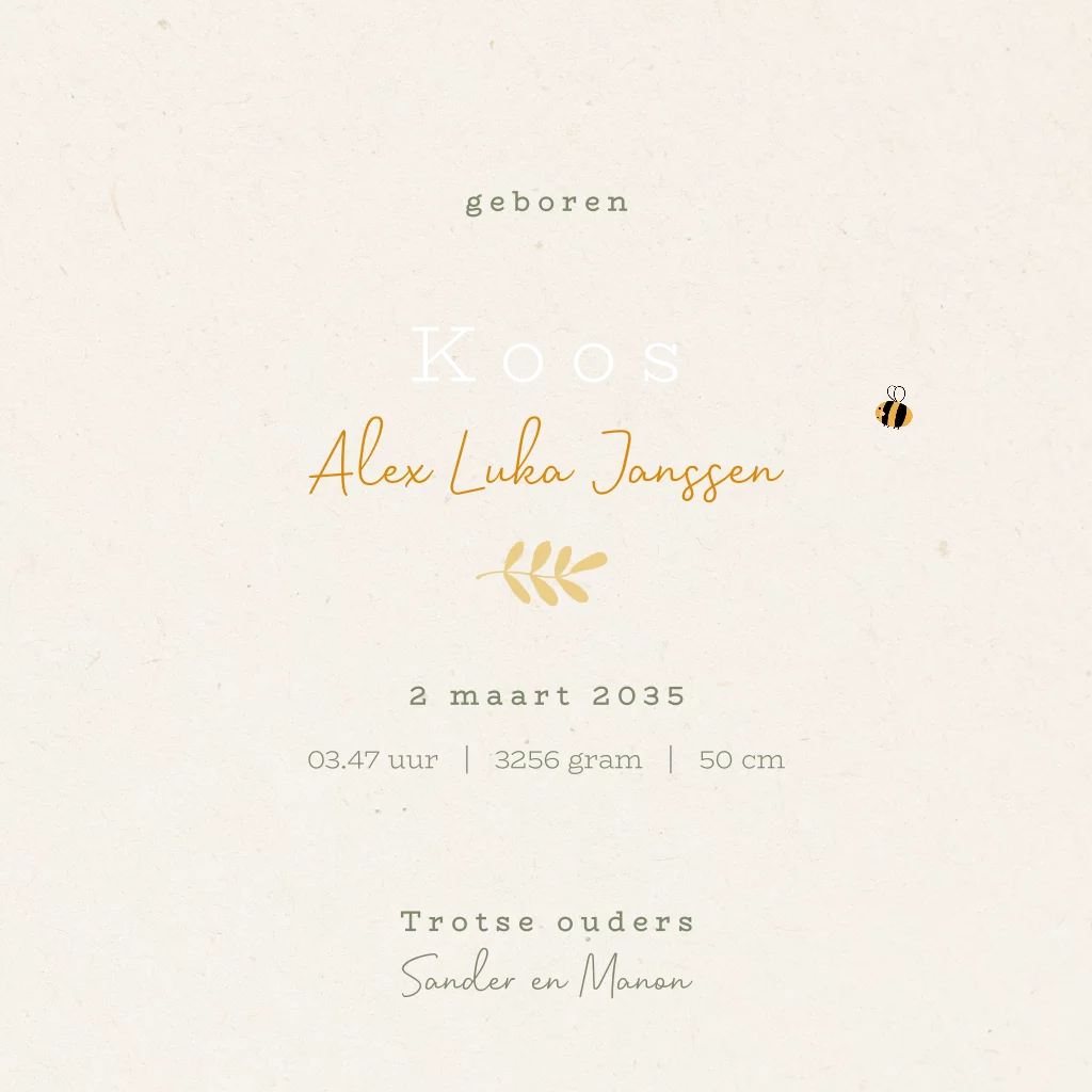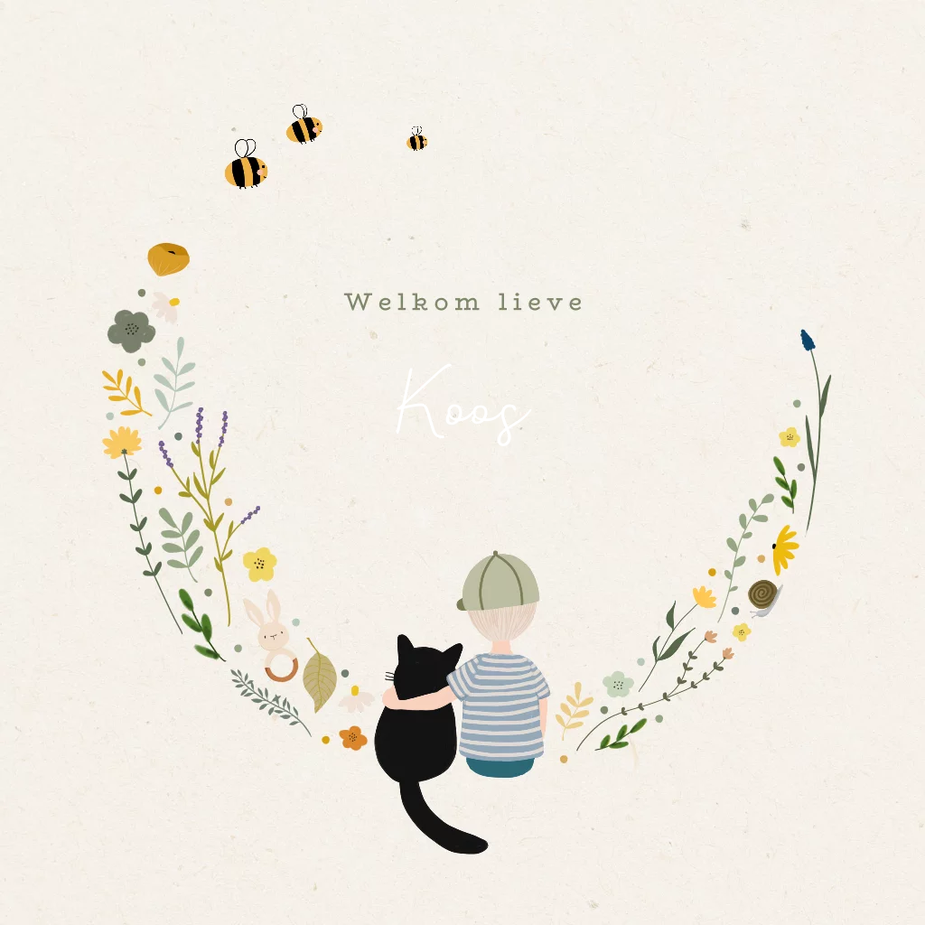 Lief lente geboortekaartje met bloemen, een bijtring, beestjes, een jongen met een kat en goudfolie.