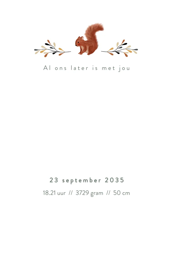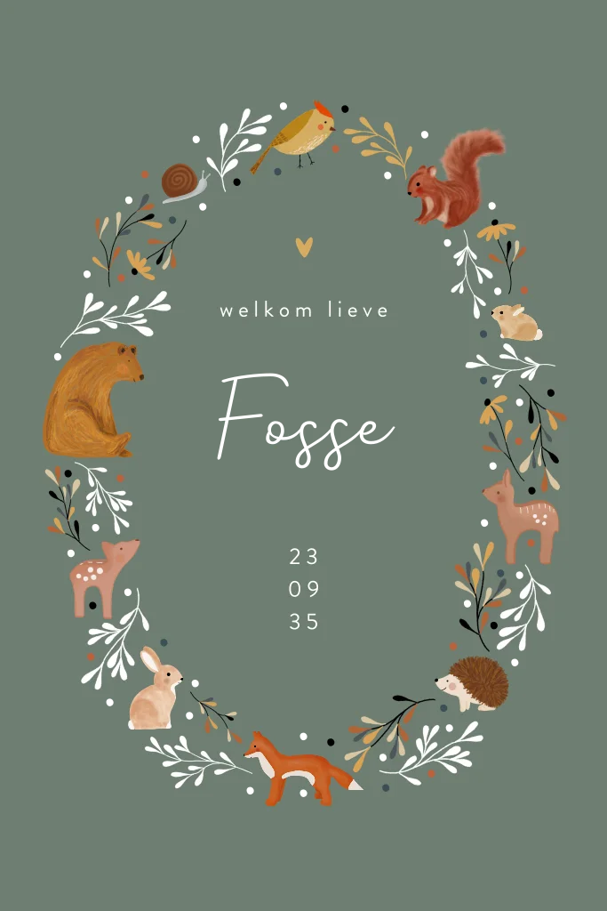 Lief herfst geboortekaartje, met bosdieren - een eekhoorntje, een vogeltje, een vos, konijntjes, een slakje, een egeltje, hertjes en een beer - goudfolie en blaadjes.