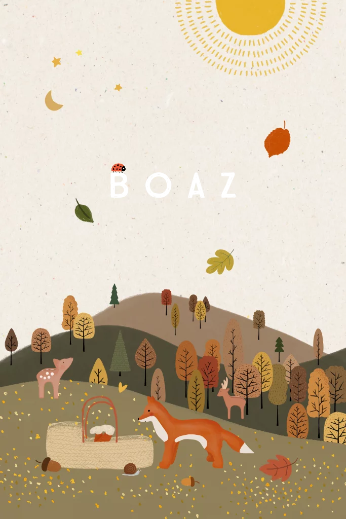 Geboortekaartje met heuvels, herfstbomen, vallende blaadjes, bosdieren en een reismandje met een babytje erin.