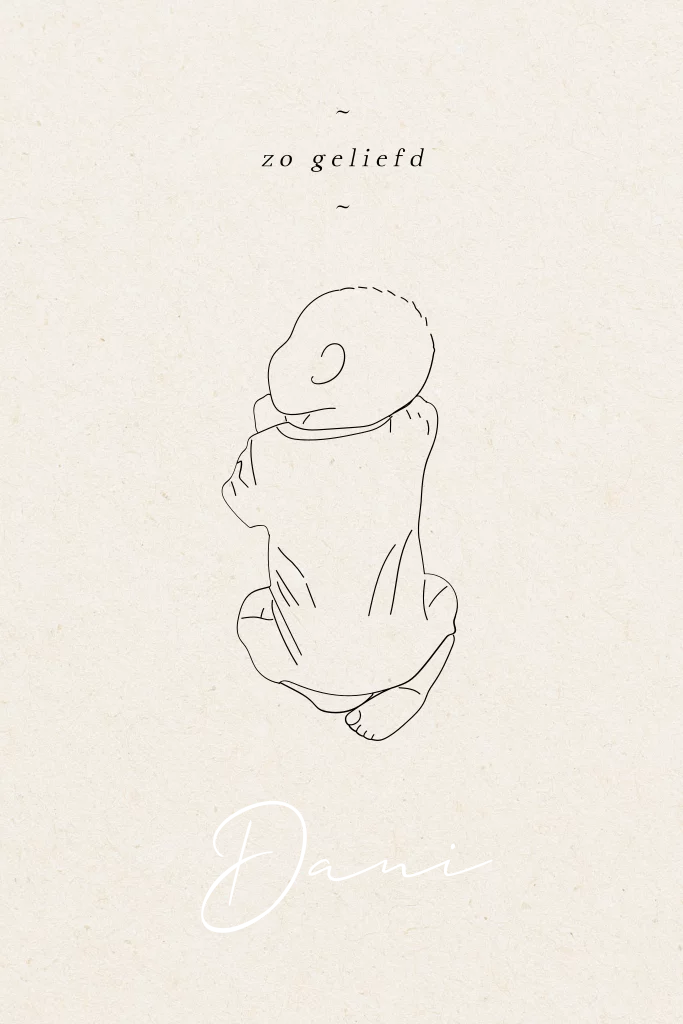 Enkel staand geboortekaartje met een lijntekening van een baby en de naam in goudfolie.