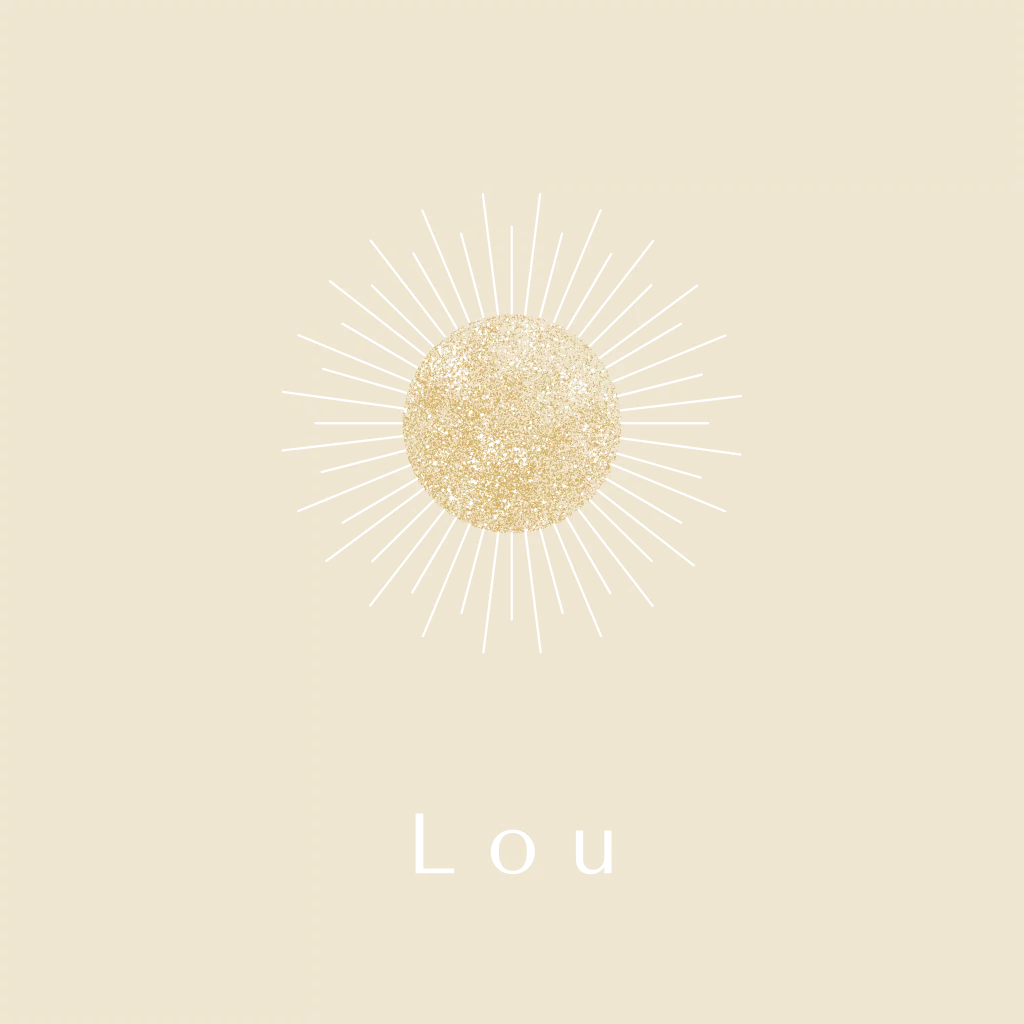 Enkel vierkant genderneutraal geboortekaartje met de zon en de naam op de voorkant van het kaartje in goudfolie.