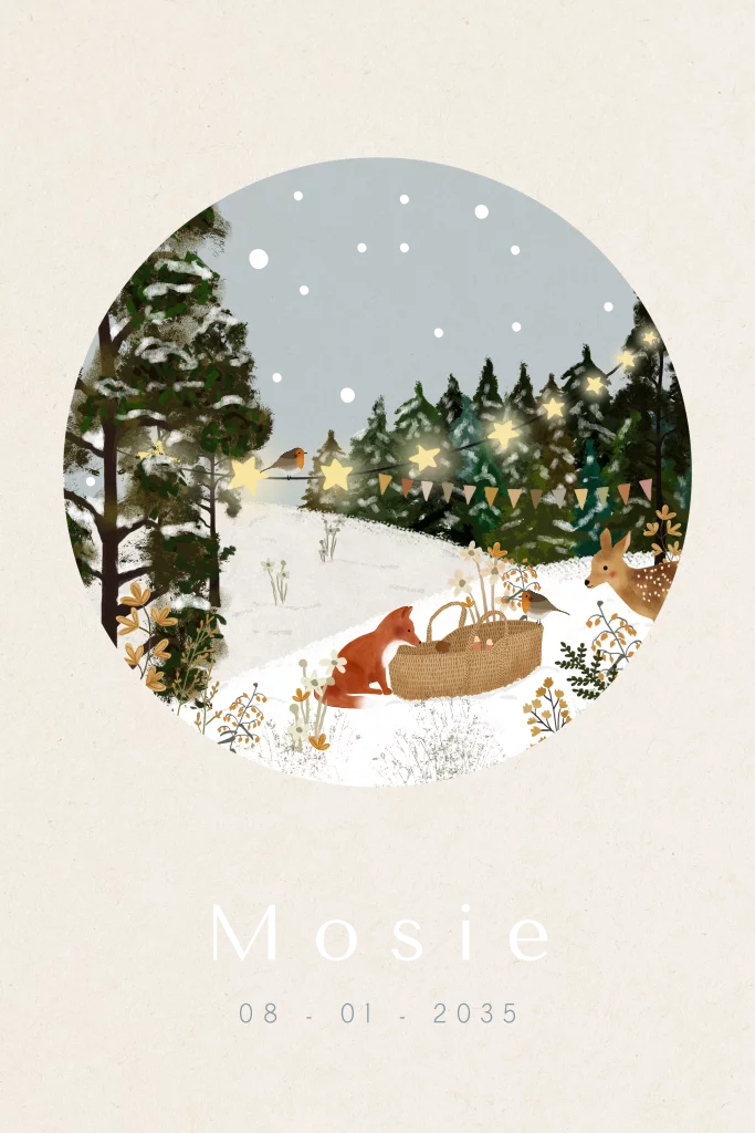 Neutraal geboortekaartje met winterlandschap, dieren en goudfolie