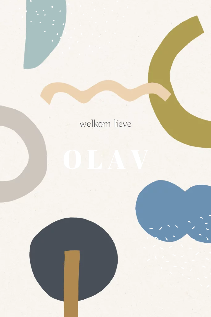 Staand geboortekaartje met abstracte vormen in fijne kleuren en goudfolie. Zijn het niet helemaal de kleuren die bij jullie of bijvoorbeeld de babykamer passen? Dan kun je de kleuren en eventueel de positie van de vormen gemakkelijk aanpassen.