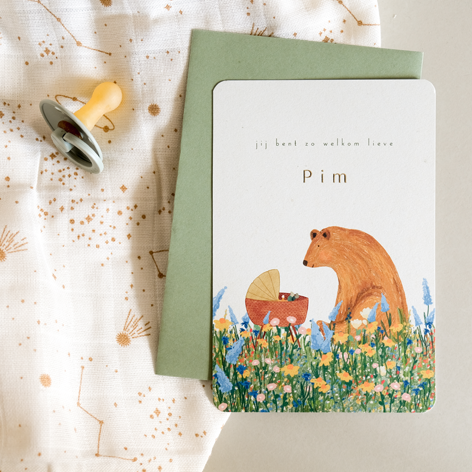 Staand geboortekaartjes met een bloemenveld, een wiegje en een grote vriendelijke beer.
