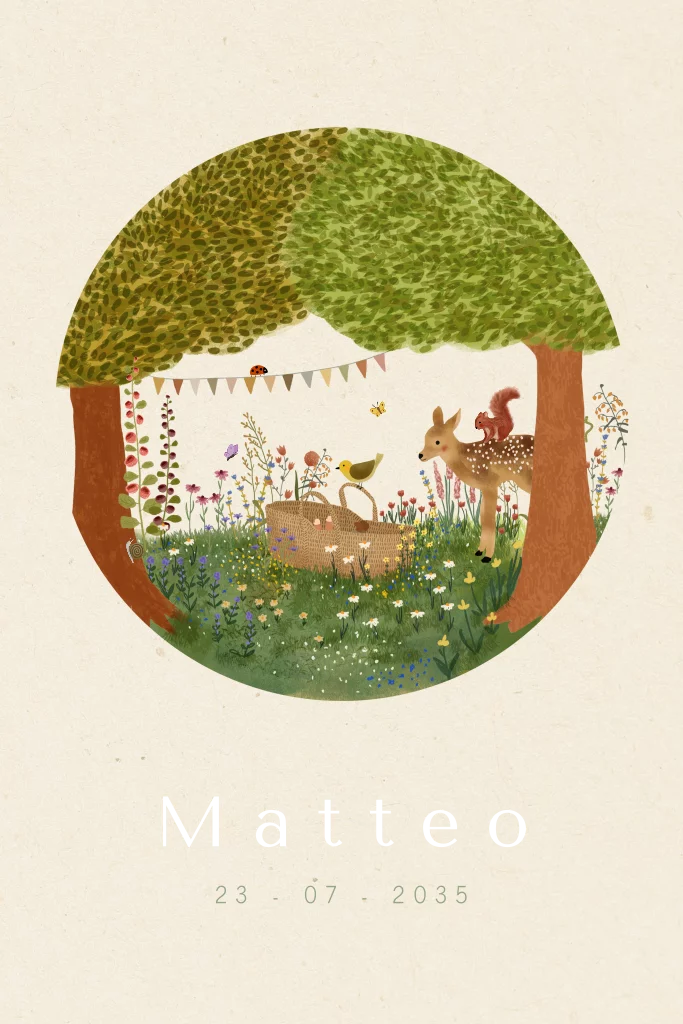 Dit is het perfecte geboortekaartje voor jouw kleine meisje of jongen! Het is een dubbel geboortekaartje en is genderneutraal. Op de voorkant zie je een schattig kindje in een reiswiegje, omringd door een hertje, vlinders, bomen, gras, bloemen, een eekhoorn en de naam in goudfolie