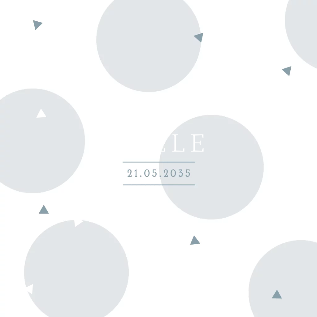 Enkel vierkant geboortekaartje met goudfolie driehoekjes en blauwe cirkels.