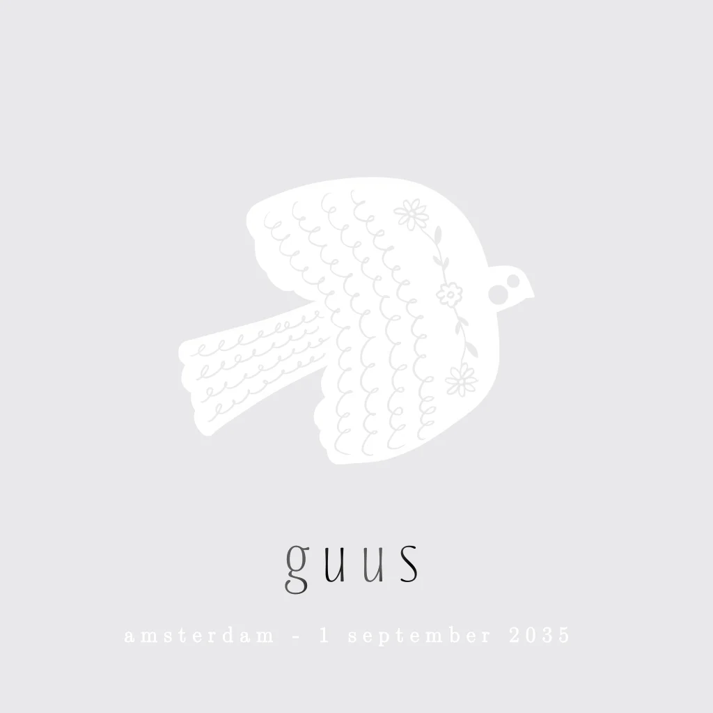 Vierkant geboortekaartje met een vogel en zwartfolie